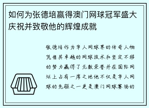 如何为张德培赢得澳门网球冠军盛大庆祝并致敬他的辉煌成就
